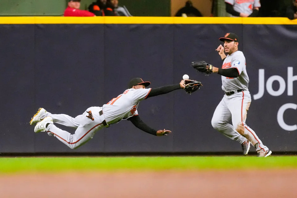April 18: Miami Marlins outfielder Kyle Stowers (28) makes a diving catch against the Philadelphia Phillies.
