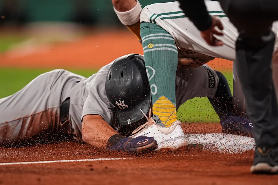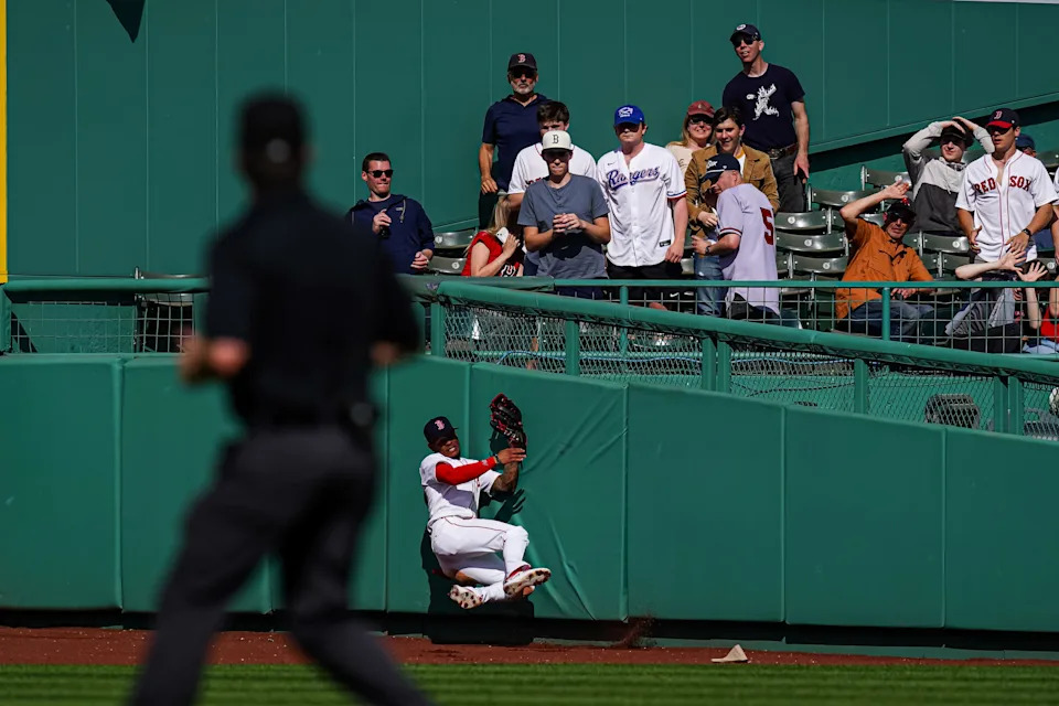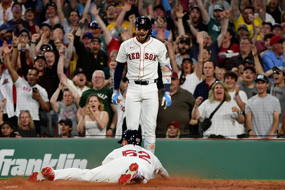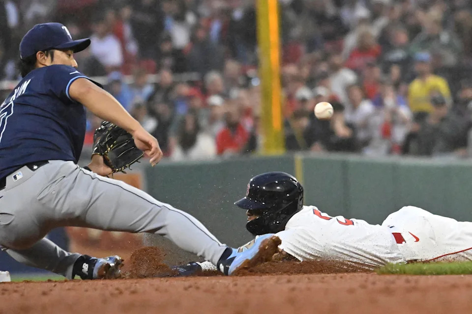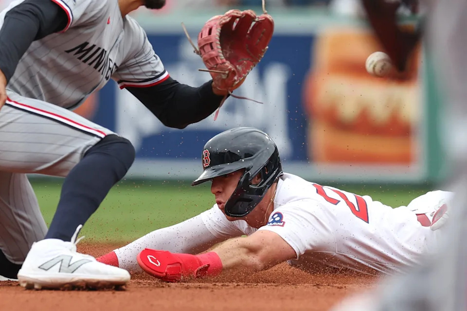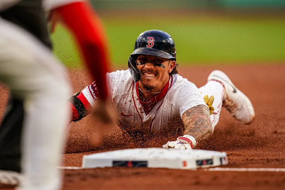 April 22: The Boston Red Sox’s Jarren Duran slides into third base for a triple against the Seattle Mariners in the first inning at Fenway Park. The Red Sox won the game, 8-3.