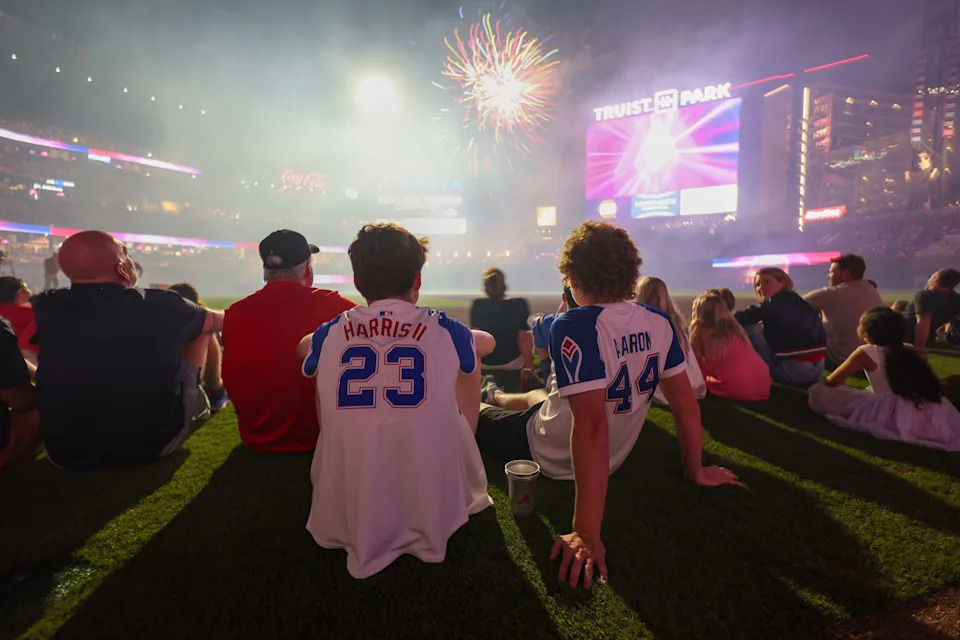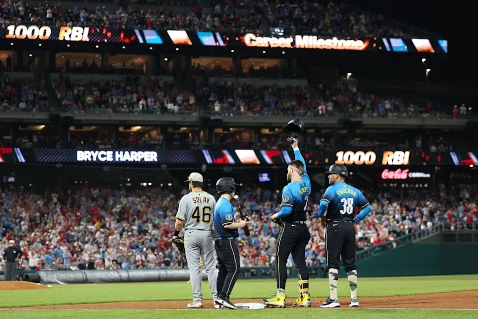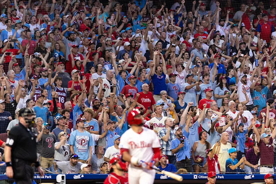 July 19: Philadelphia Phillies outfielder Kyle Schwarber hits a grand slam during the sixth inning against the Los Angeles Angels at Citizens Bank Park.