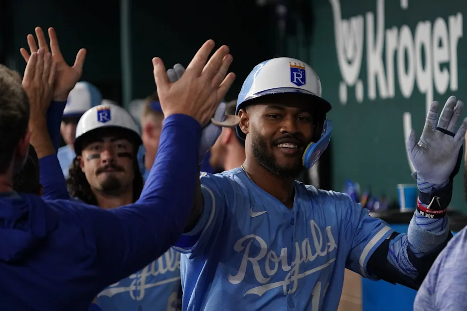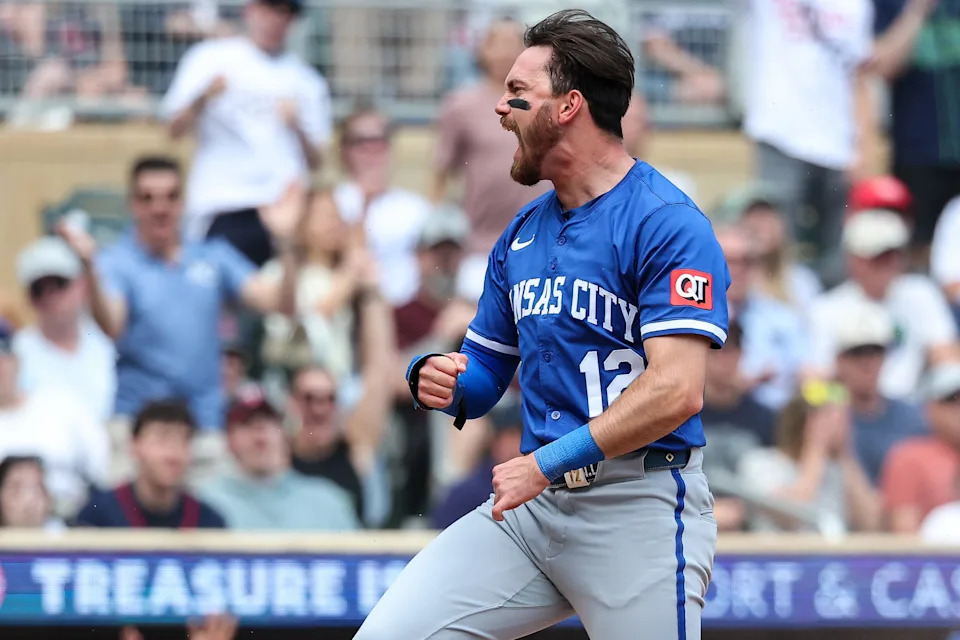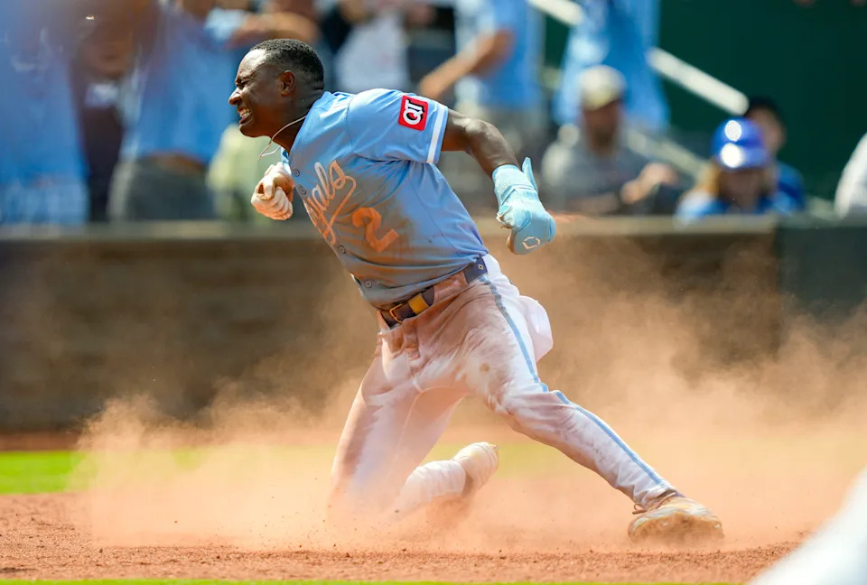 July 13: The Kansas City Royals’ Tyler Tolbert celebrates after scoring the game winning run during the ninth inning against the New York Mets at Kauffman Stadium. The Royals won the game, 3-2.