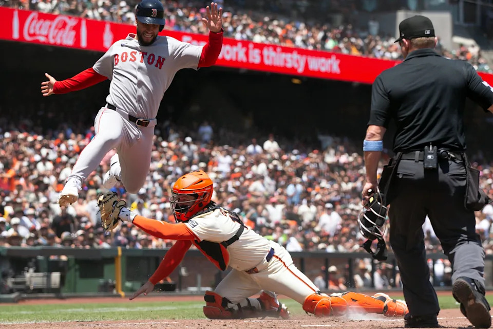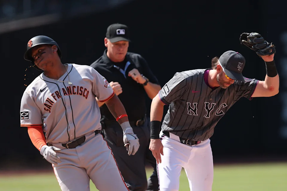 Aug. 3: The San Francisco Giants’ Rafael Devers reacts after being tagged out by New York Mets second baseman Jeff McNeil while attempting to stretch a single into a double during the seventh inning at Citi Field. The Giants won the game, 12-4.