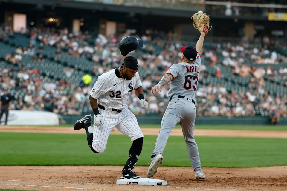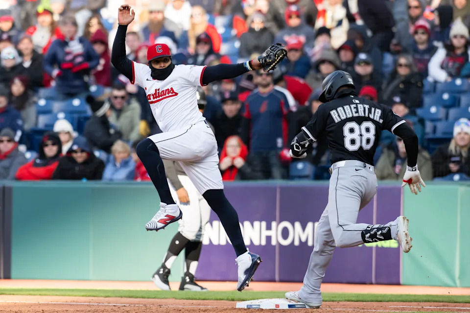 April 8: Cleveland Guardians first baseman Carlos Santana (41) leaps for the throw as the Chicago White Sox’s Luis Robert Jr. (88) is safe at first during the ninth inning at Progressive Field. The Guardians won the game, 1-0.