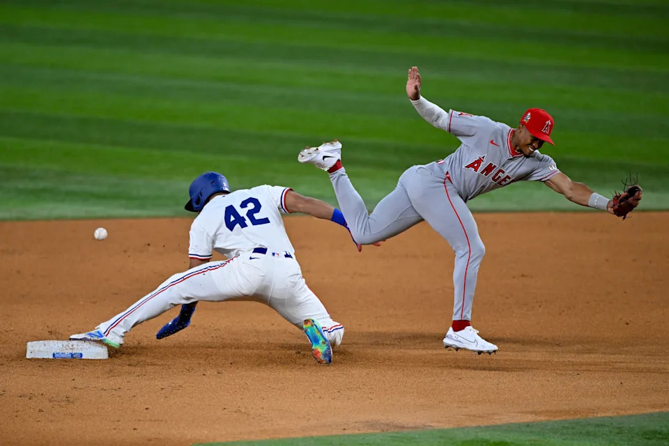 April 15: Texas Rangers center fielder Leody Taveras steals second base against the Los Angeles Angels while wearing 42 on Jackie Robinson Day.