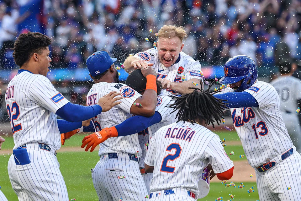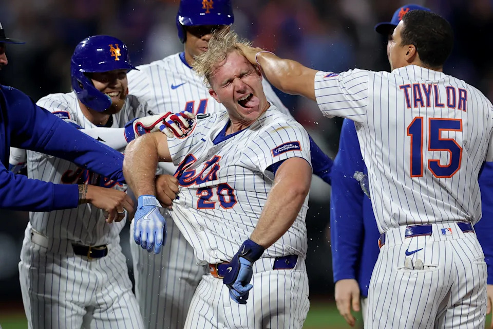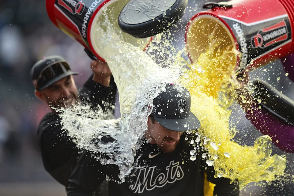 Aug. 16: New York Mets pitcher Nolan McLean is doused after the Mets defeated the Seattle Mariners at Citi Field.
