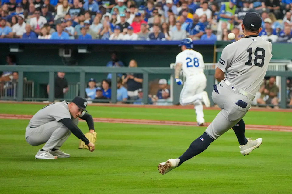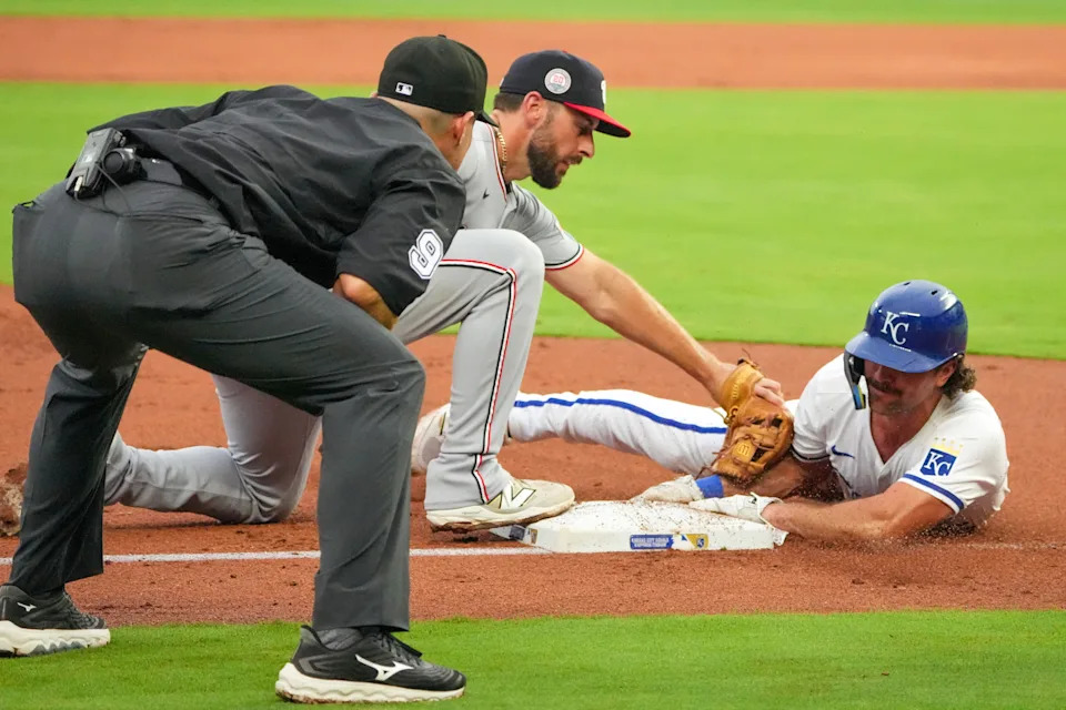 Aug. 11: Washington Nationals third baseman Paul DeJong misses the tag as the Kansas City Royals’ Adam Frazier reaches third base in the second inning at Kauffman Stadium. The Royals won the game, 7-4.