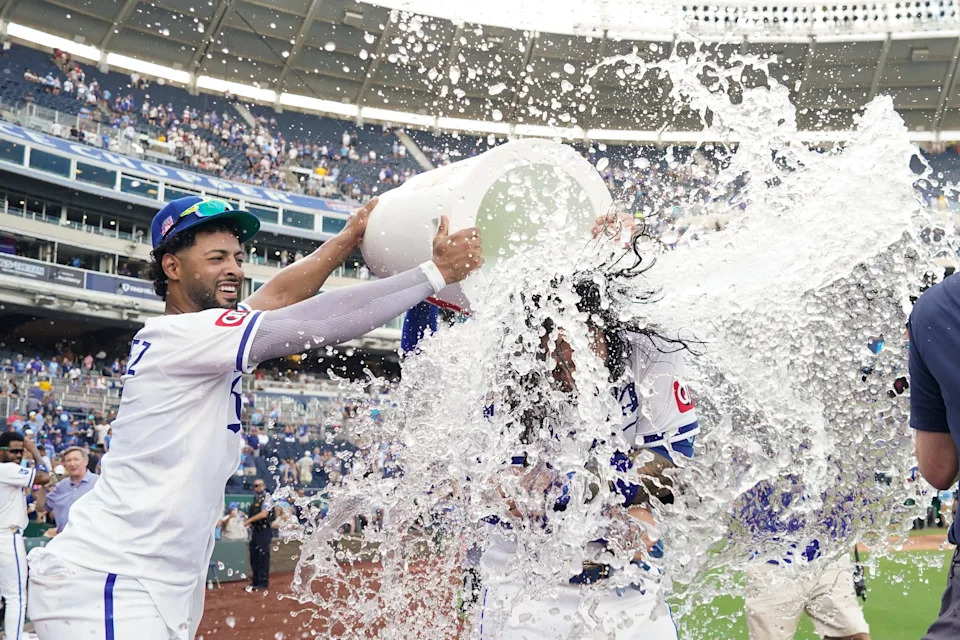 July 26: Kansas City Royals designated hitter Jonathan India (6) is doused by left fielder MJ Melendez (1) after hitting a three run walk off home run against the Cleveland Guardians in the 10th inning at Kauffman Stadium.