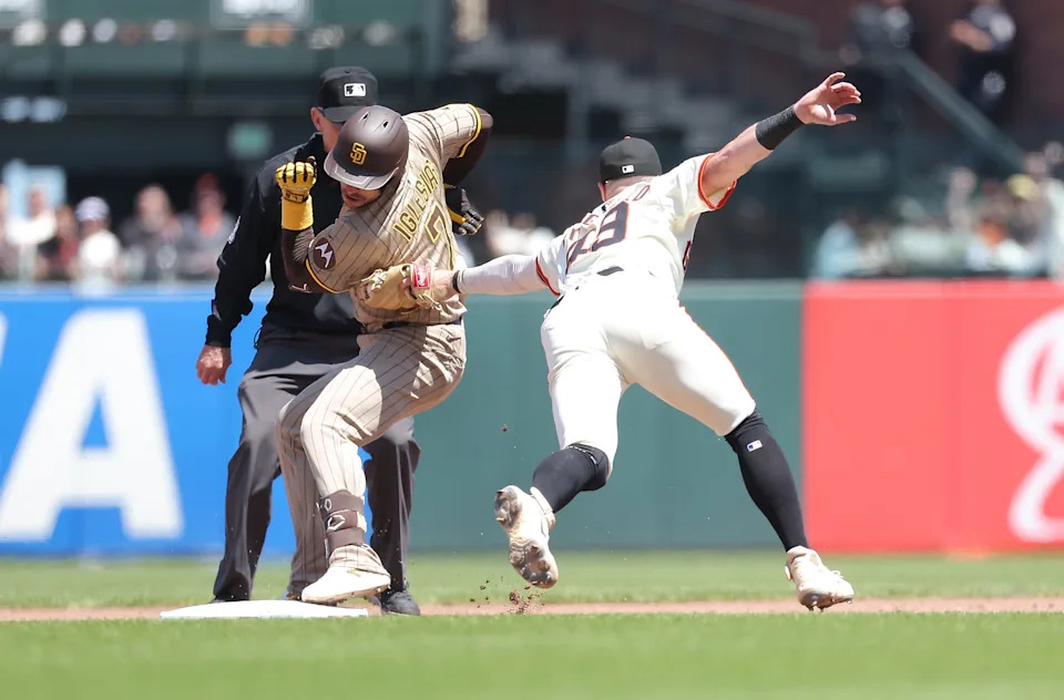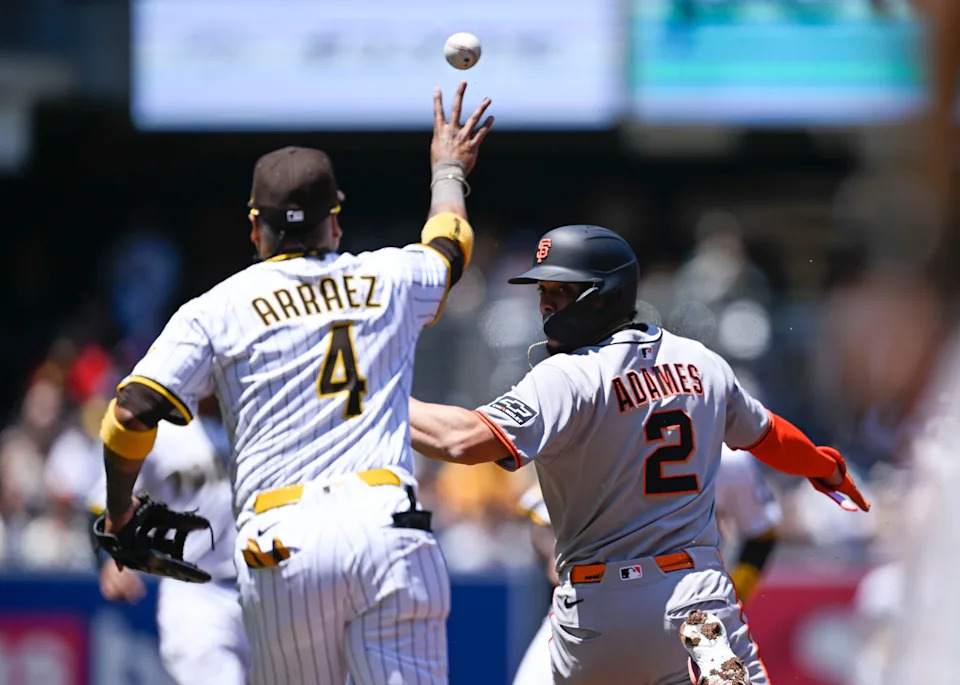 April 30: The San Francisco Giants’ Willy Adames (2) is caught in a rundown by San Diego Padres first baseman Luis Arraez during the first inning at Petco Park. Adames was out on the play.