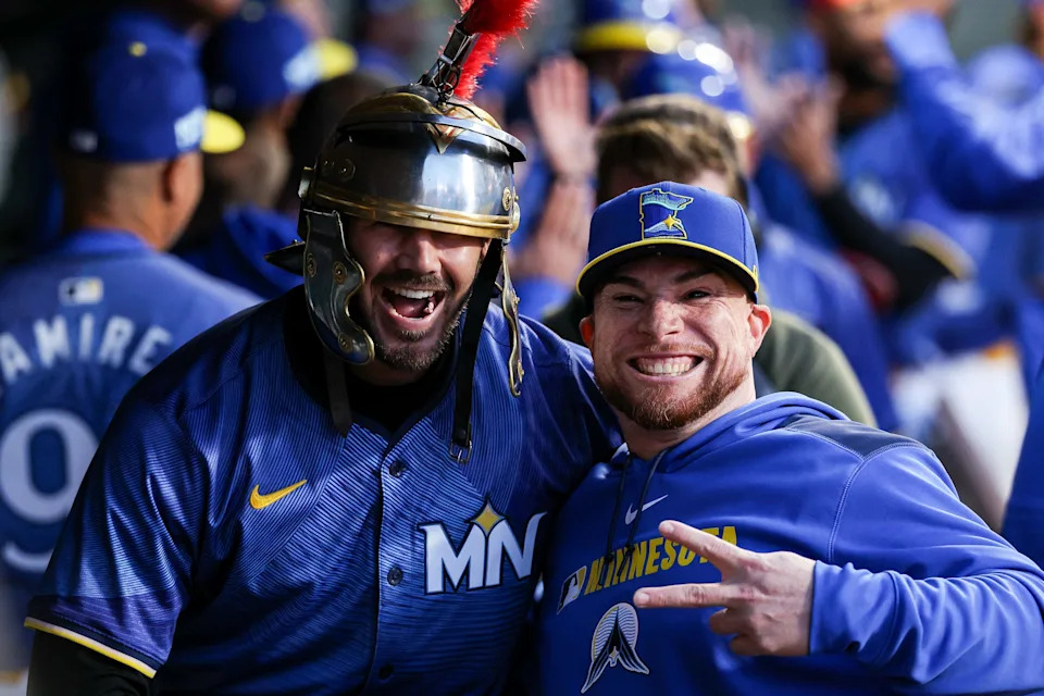 April 25: Minnesota Twins right fielder Trevor Larnach (9) celebrates his three-run home run with Christian Vazquez (8) during the fourth inning against the Los Angeles Angels.