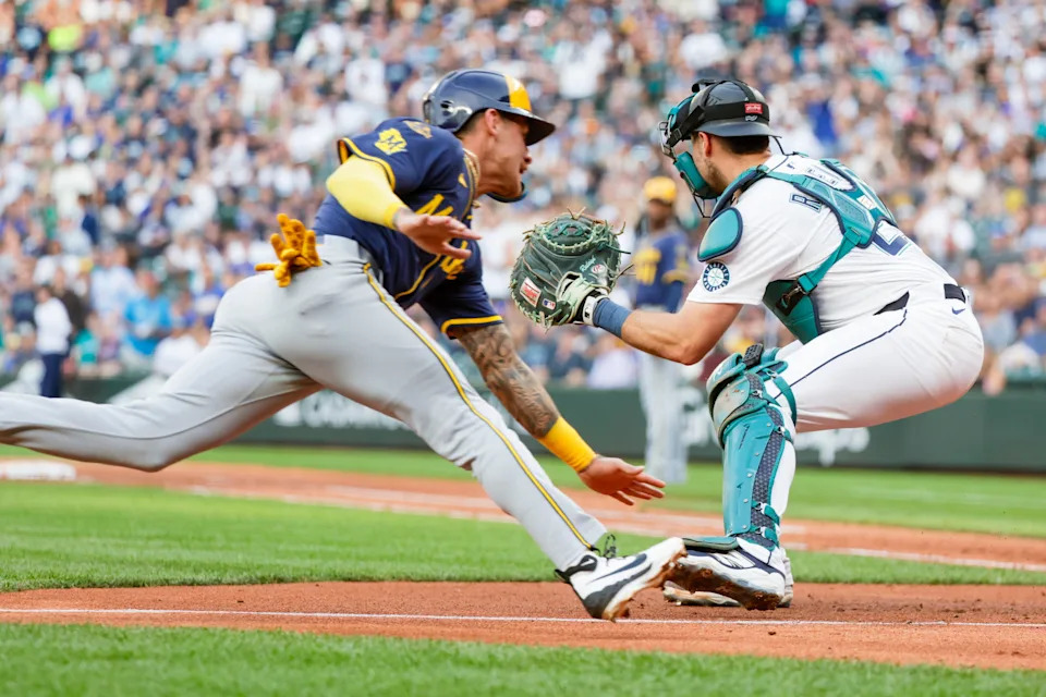July 21: The Milwaukee Brewers’ Joey Ortiz slides home to score a run as Seattle Mariners catcher Cal Raleigh takes the throw to home during the sixth inning at T-Mobile Park. The Brewers won the game, 6-0, for an 11th consecutive victory.