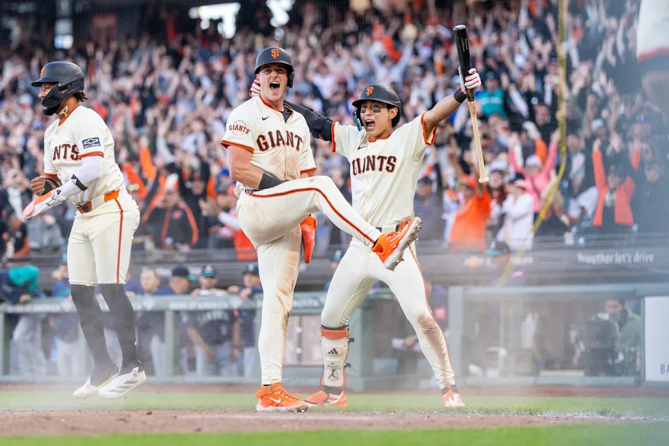 April 4: San Francisco Giants shortstop Tyler Fitzgerald (49) and outfielder Jung Hoo Lee (51) celebrate a victory against the Seattle Mariners.