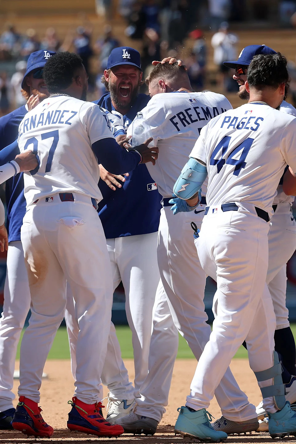 July 23: Freddie Freeman celebrates with Clayton Kershaw and other Los Angeles Dodgers teammates after hitting a game-winning RBI single during the ninth inning against the Minnesota Twins at Dodger Stadium. The Dodgers won the game, 4-3.