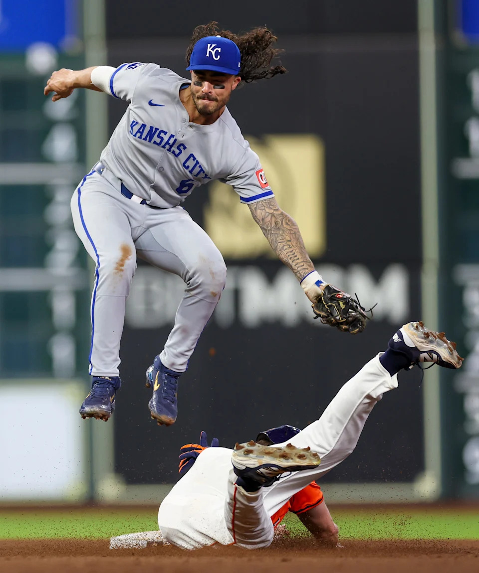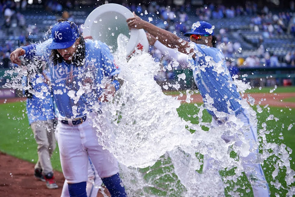April 10: The Kansas City Royals’ Jonathan India is doused by teammates MJ Melendez and Bobby Witt Jr. after a 3-2 win over the Minnesota Twins at Kauffman Stadium.