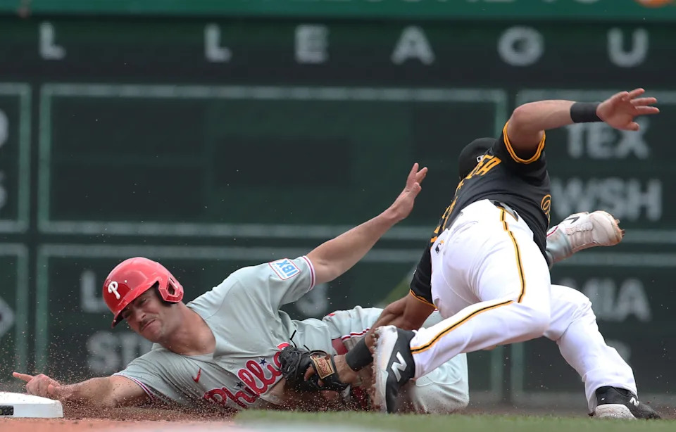 April 9: Pittsburgh Pirates first baseman Endy Rodriguez and catcher Joey Bart collide while attempting to catch a pop-up hit by the St. Louis Cardinals’ Willson Contreras during the eighth inning at PNC Park. The Pirates won the game, 2-1, in 13 innings.