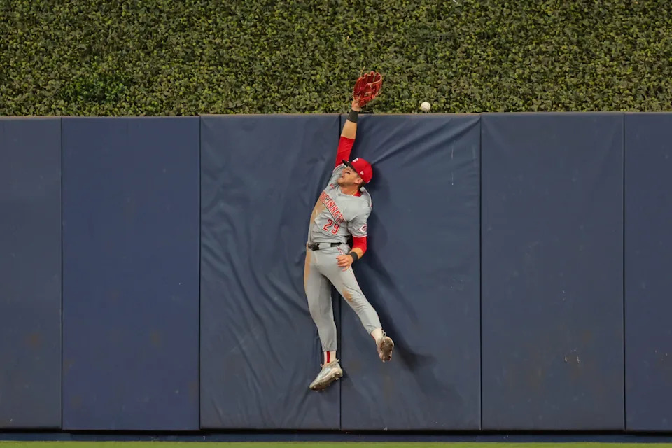 April 21: Cincinnati Reds center fielder TJ Friedl jumps but cannot catch a home run hit by the Miami Marlins’ Eric Wagaman during the fifth inning at loanDepot Park. The Marlins won the game, 6-3.