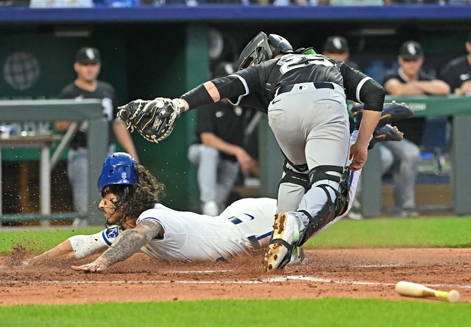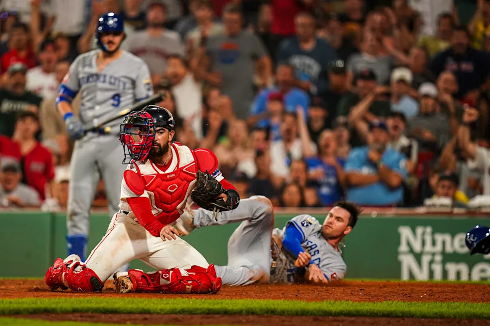 Aug. 4: The Kansas City Royals’ Nick Loftin is tagged out at home plate by Boston Red Sox catcher Connor Wong to end the eighth inning at Fenway Park. The Red Sox won the game, 8-5.