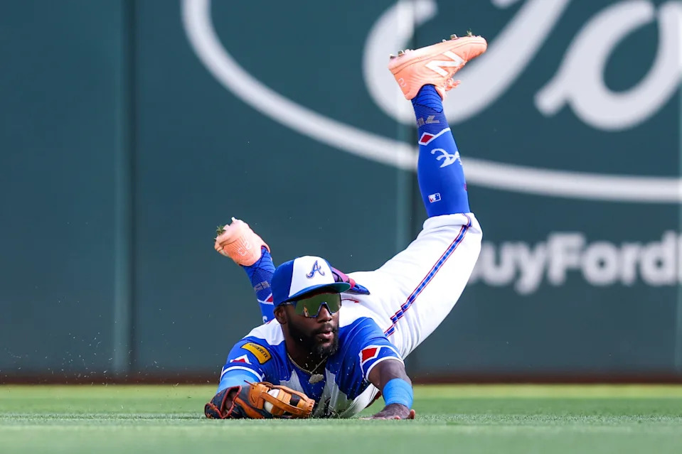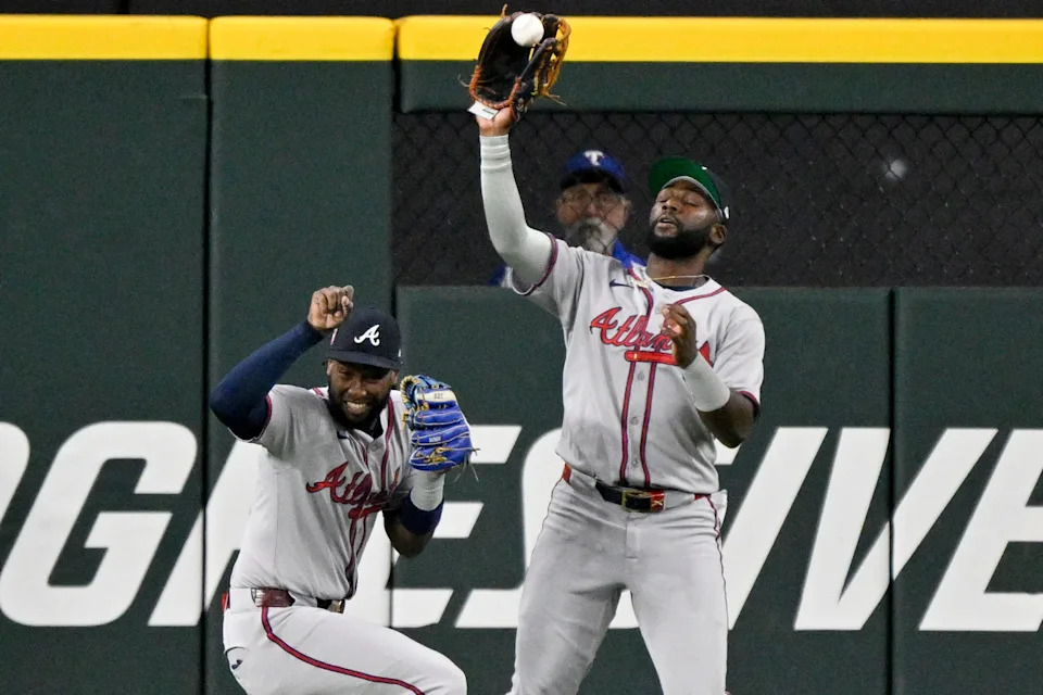 July 25: Atlanta Braves center fielder Michael Harris II (23) catches a sacrifice fly hit by Texas Rangers second baseman Marcus Semien as left fielder Jurickson Profar (7) avoids the collision during the first inning at Globe Life Field.