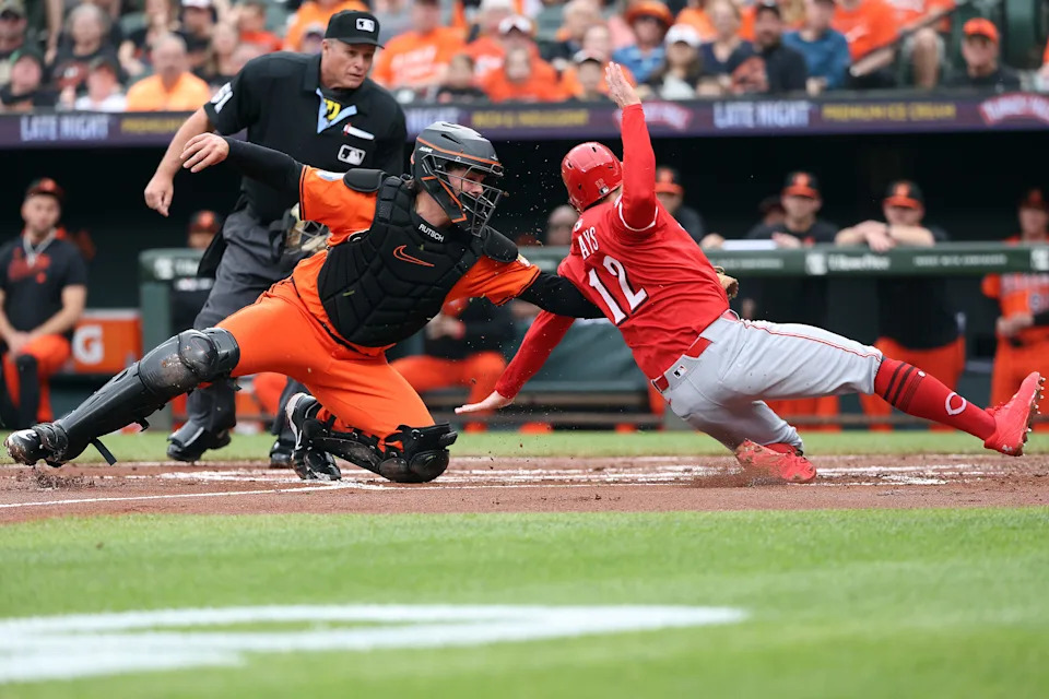April 19: Baltimore Orioles catcher Adley Rutschman tags out the Cincinnati Reds’ Austin Hays at home plate during the first inning at Oriole Park at Camden Yards. The Orioles won the game, 9-5.