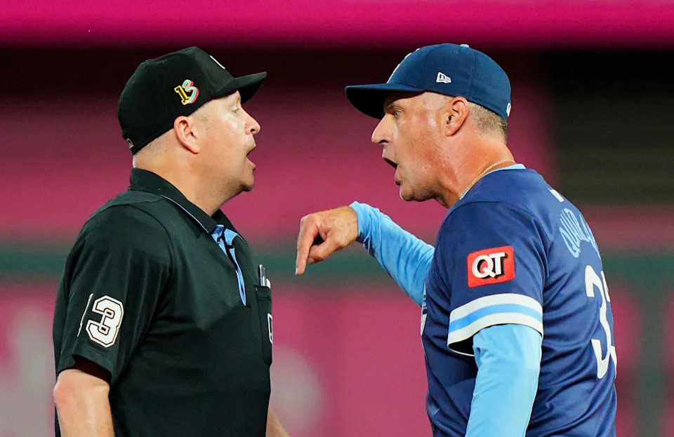 Aug. 15: Kansas City Royals manager Matt Quatraro argues with second base umpire Tom Hanahan during the fifth inning against the Chicago White Sox at Kauffman Stadium.