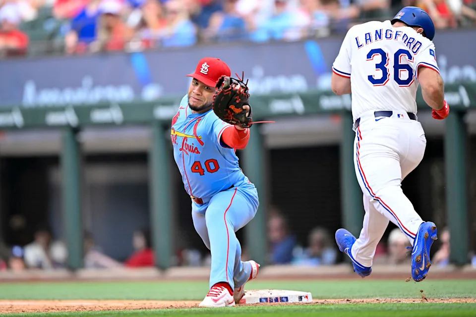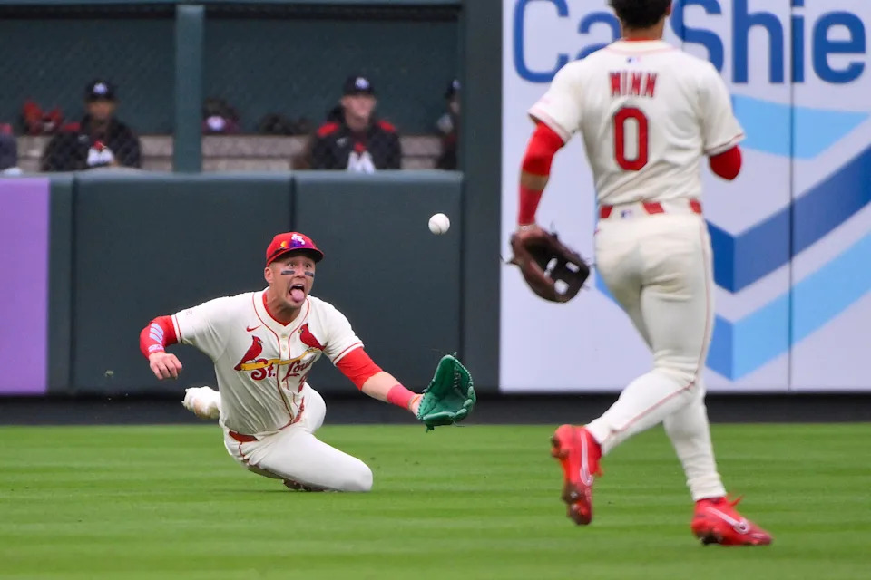 March 29: St. Louis Cardinals left fielder Lars Nootbaar dives and catches a line drive hit by the Minnesota Twins’ Jose Miranda during the second inning at Busch Stadium. The Cardinals won the game, 5-1.