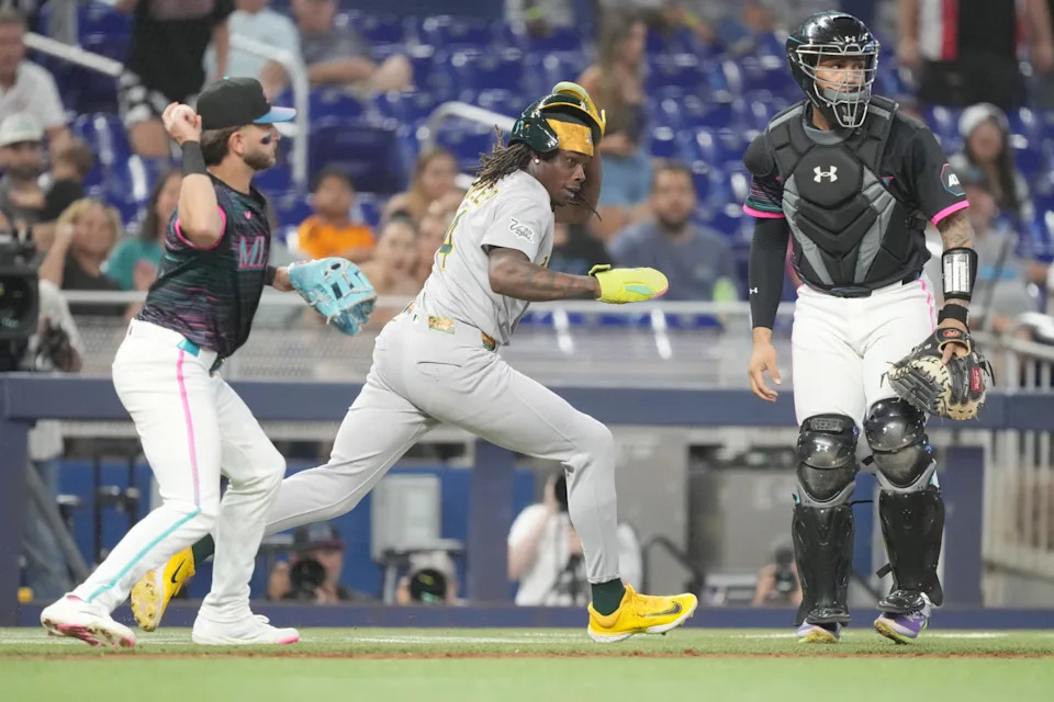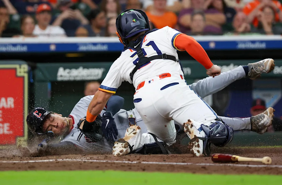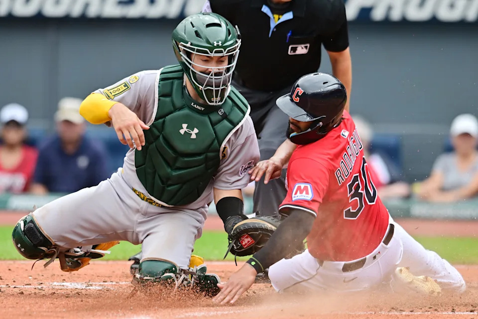 July 20: Athletics catcher Shea Langeliers tags out the Cleveland Guardians’ Johnathan RodrÃguez during the fourth inning at Progressive Field. The Guardians won the game, 8-2.
