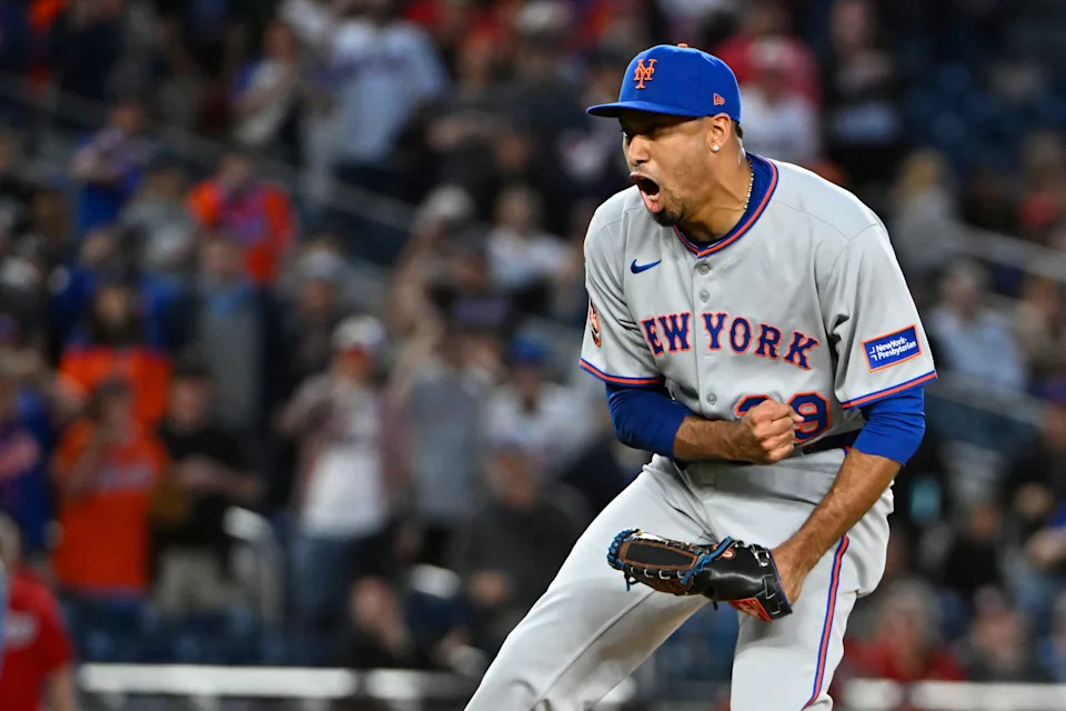 April 26: New York Mets pitcher Edwin Diaz (39) celebrates after the final out against the Washington Nationals.
