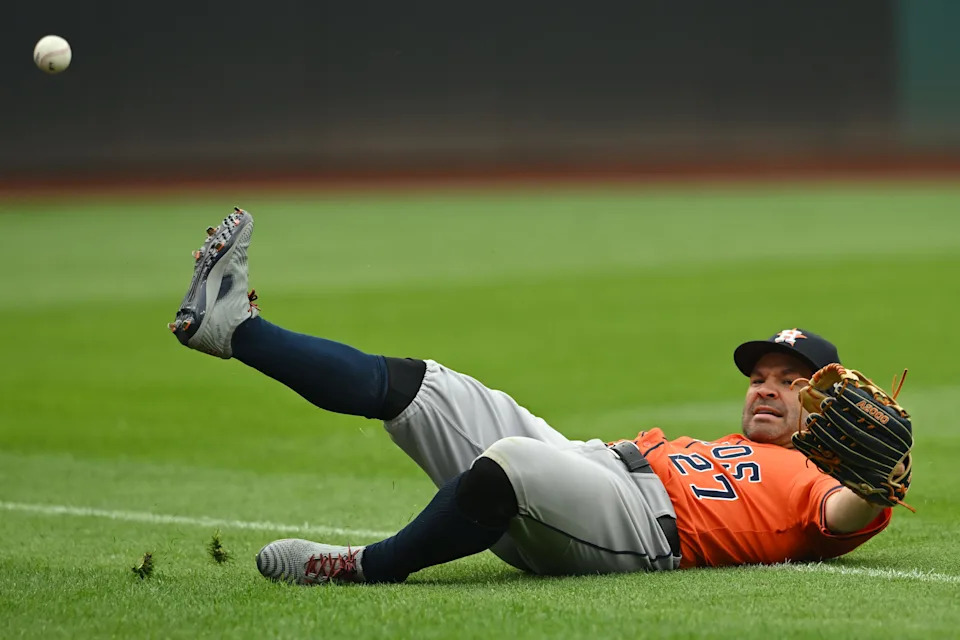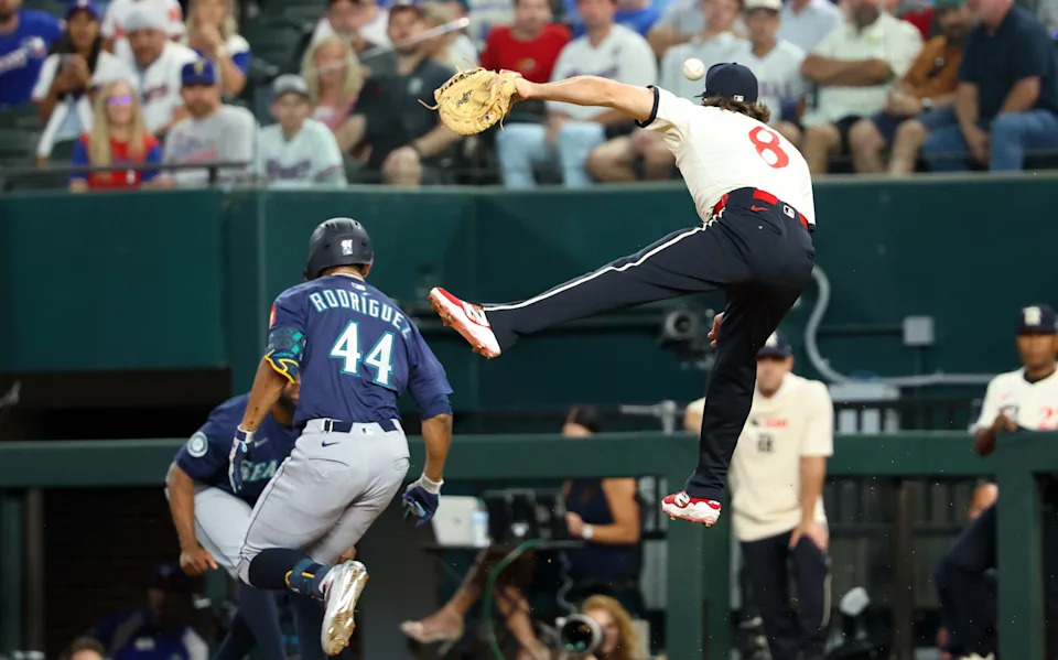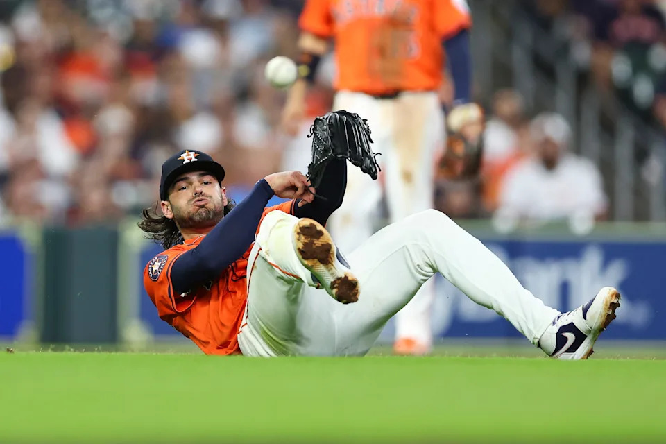 July 11: Houston Astros starting pitcher Lance McCullers Jr. throws from the ground but is unable to get an out on an infield single by Texas Rangers first baseman Jake Burger during the third inning at Daikin Park.