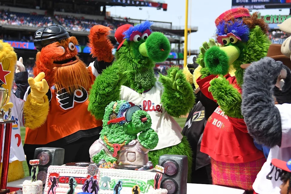 April 20: The Phillie Phanatic celebrates his birthday with his mom, Phoebe, and his mascot friends before the game between the Miami Marlins and Philadelphia Phillies at Citizens Bank Park. The Marlins won the game, 7-5, in 10 innings.