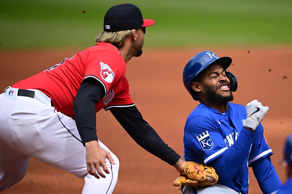 April 13: The Kansas City Royals’ Maikel Garcia (11) is tagged out by Cleveland Guardians third baseman Gabriel Arias (13) during the first inning at Progressive Field. The Royals won the game, 4-2.