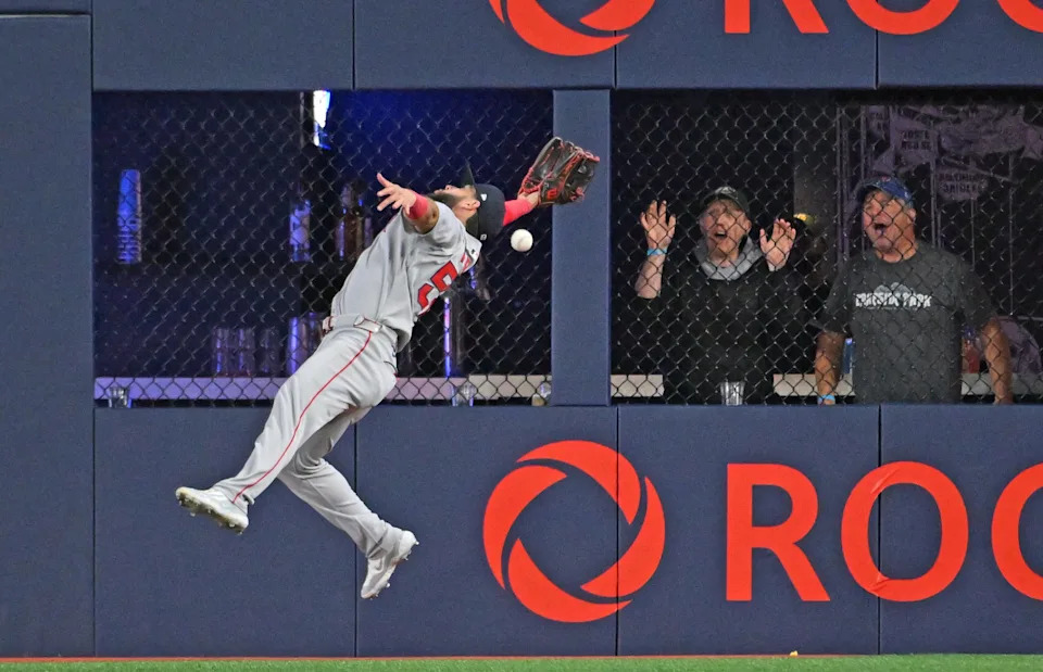 May 1: Boston Red Sox right fielder Wilyer Abreu (52) fails to catch a ball hit by Toronto Blue Jay shortstop Bo Bichette in the eighth inning at Rogers Centre.