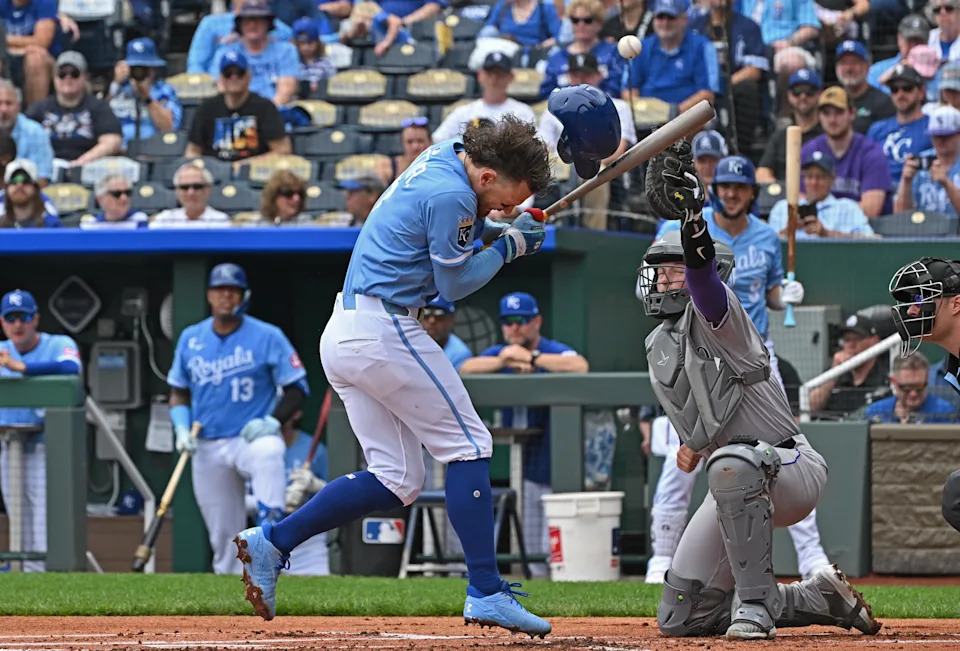 April 24: The Kansas City Royals’ Bobby Witt Jr. reacts after getting hit by a pitch by the Colorado Rockies’ German Marquez during the first inning at Kauffman Stadium. The Royals won the game, 6-2.