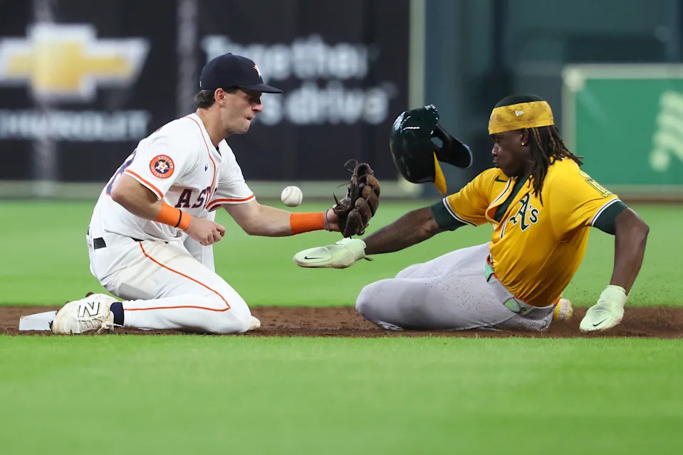 July 24: Athletics center fielder Lawrence Butler (4) is safe at second base as Houston Astros shortstop Zack Short (38) fields a throw during the second inning at Daikin Park.