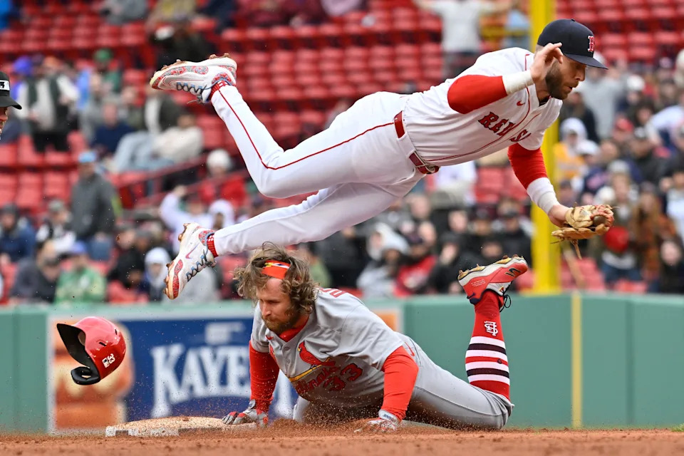 April 6: Boston Red Sox shortstop Trevor Story leaps out of the way as the St. Louis Cardinals’ Brendan Donovan continues to slide into second base during the ninth inning at Fenway Park. The Red Sox won the game, 5-4, which was Game 1 of a doubleheader. The Red Sox won the second game, 18-7.