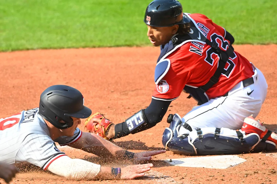 Aug. 2: Minnesota Twins left fielder Alan Roden (19) scores in the fifth inning against the Cleveland Guardians.