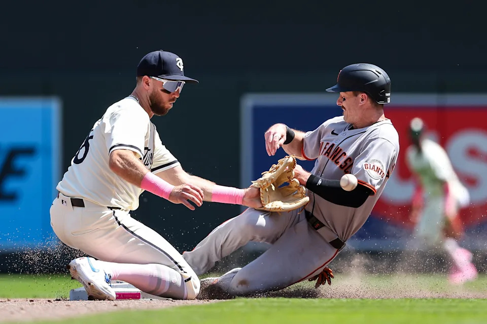 April 16: New York Mets catcher Hayden Senger tags out the Minnesota Twins’ Harrison Bader at home plate during the sixth inning at Target Field. The Twins won the game, 4-3.