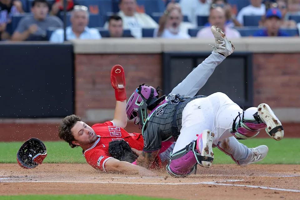 July 22: New York Mets catcher Francisco Alvarez tags out the Los Angeles Angels’ Nolan Schanuel while he tried to score on a single by Mike Trout during the first inning at Citi Field.