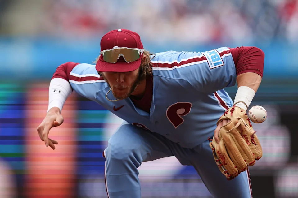 April 3: Philadelphia Phillies third base Alec Bohm is unable to field the ball for an error during the first inning against the Colorado Rockies at Citizens Bank Park. The Phillies won the game, 3-1.