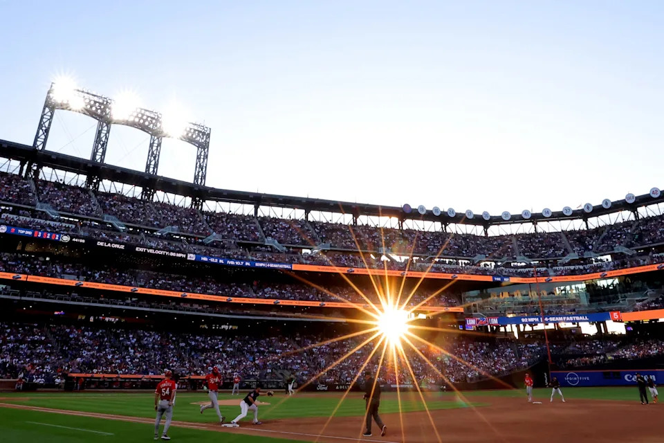 July 18: Cincinnati Reds shortstop Elly De La Cruz (44) is thrown out at first by New York Mets shortstop Francisco Lindor (12) on a ground ball as the sun sets behind Citi Field during the third inning.