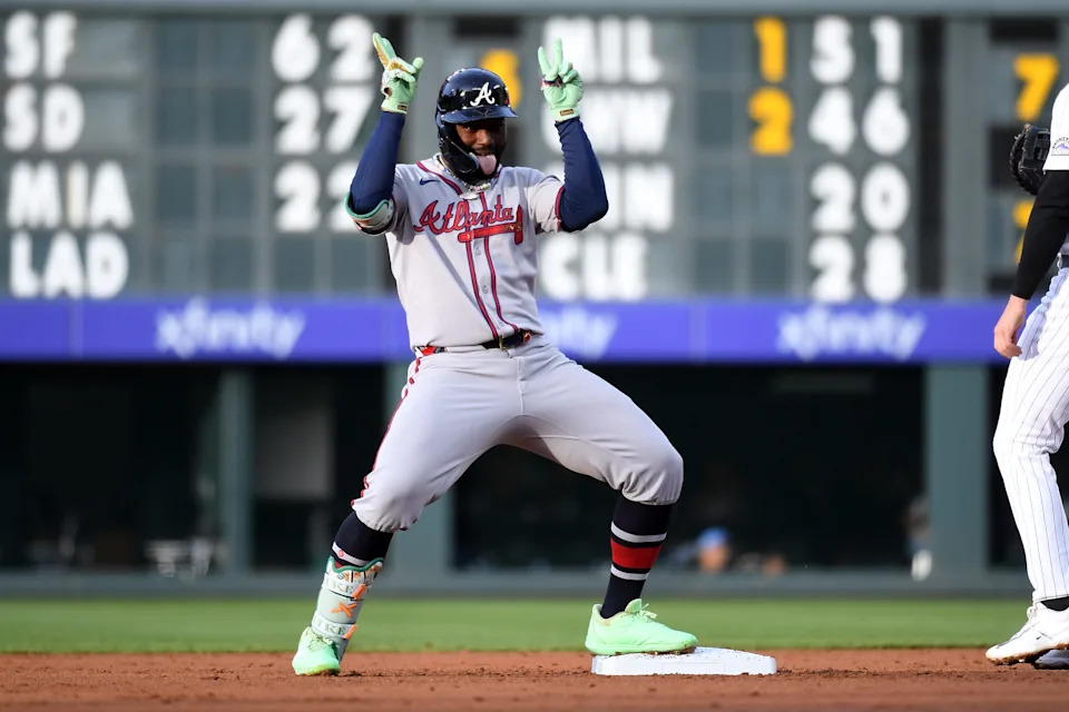 April 29: Atlanta Braves outfielder Michael Harris II (23) celebrates after a two-RBI double during the second inning against the Colorado Rockies.