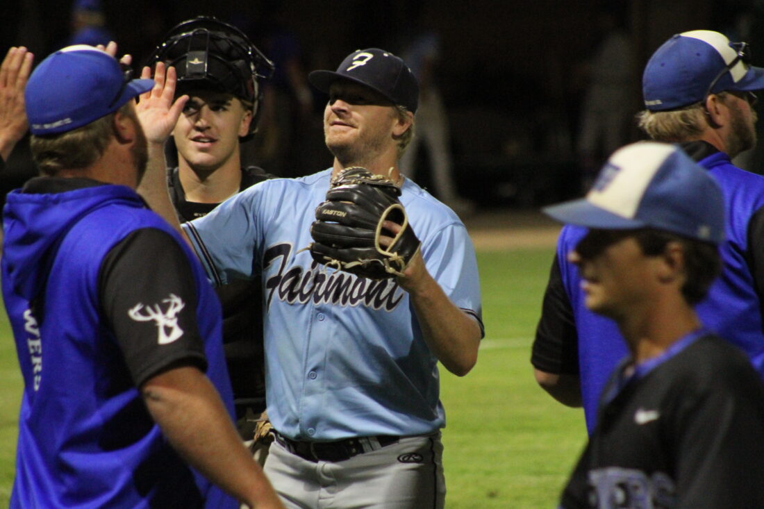 Fairmont draftee Spencer Chirpich gets high fives from New Ulm Brewers players after he got out of one of 12 innings in relief on Sunday.