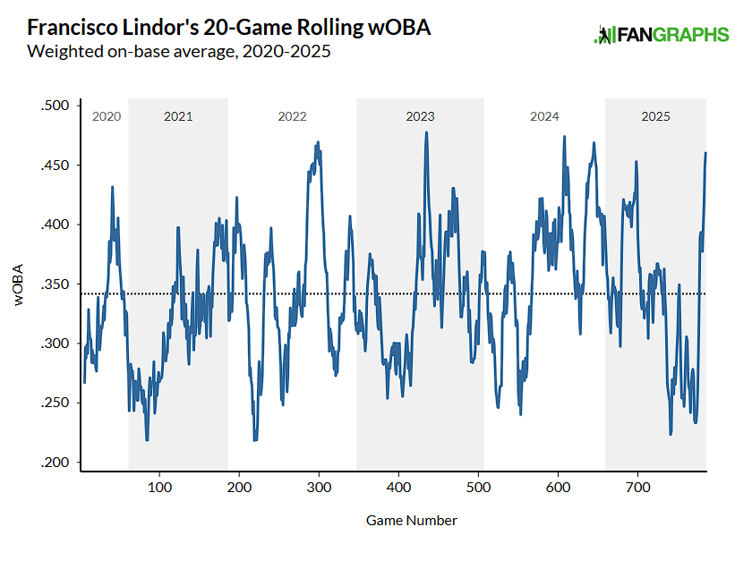 Many slumps and hot streaks are inexplicable. The reason for Lindor’s 2025 rough patch, on the other hand, is easy to pinpoint. On June 4, Lindor broke his pinky toe. Up to that point, he was hitting the ball with authority. Then, for around two months, a reasonable recovery window for such an injury, he turned into a slap hitter with below-average results on contact. Finally, and with a customary warning about arbitrary endpoints, he’s sure looked healthy since then:
