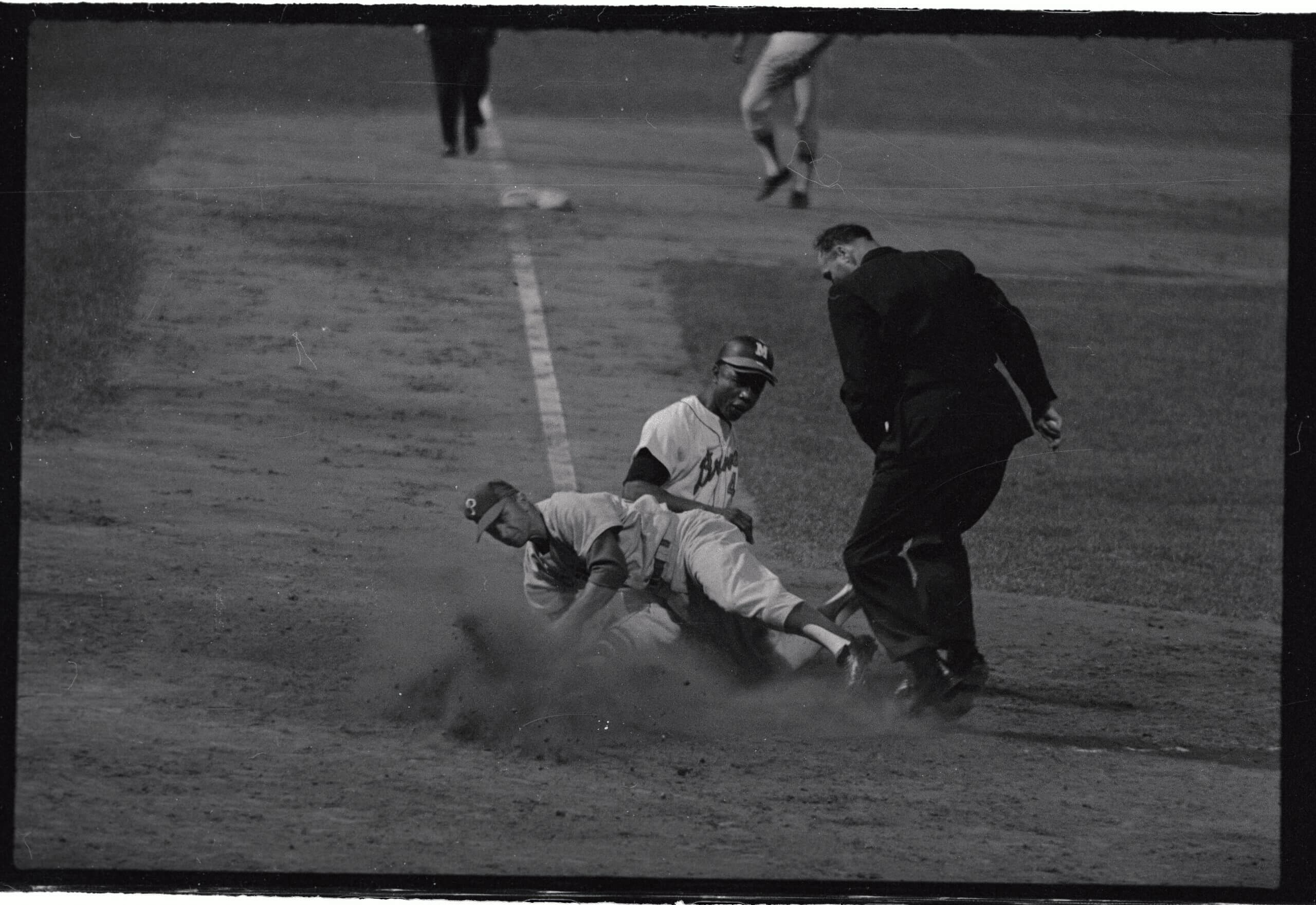 In his final season with the Phillies in 1964, Shantz collides with a sliding Hank Aaron at home. (Bettmann / Contributor)