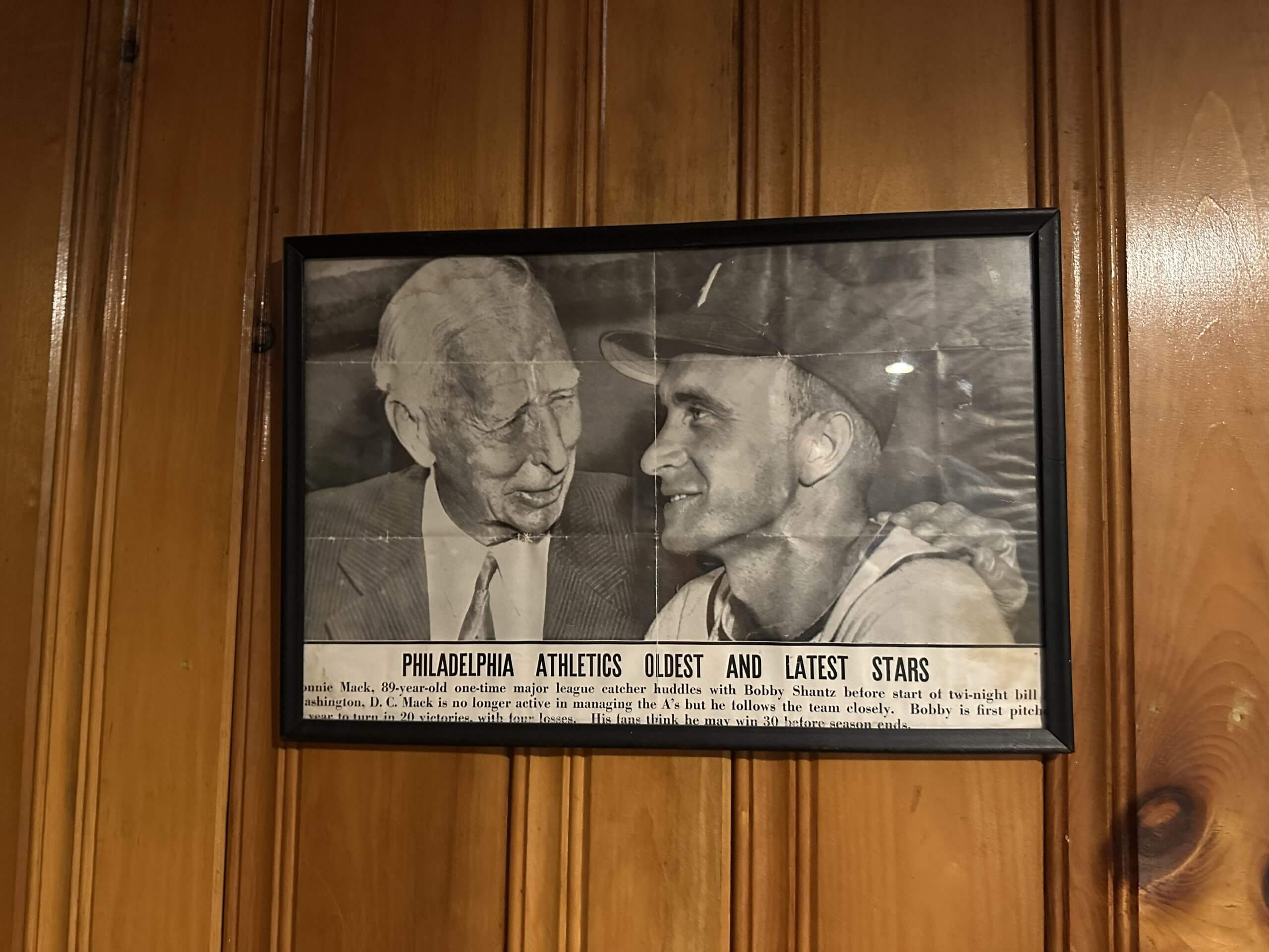 An enlarged newspaper photo of Mack and Shantz hangs on the wall in the basement of his Pennsylvania home. (Tyler Kepner/The Athletic)