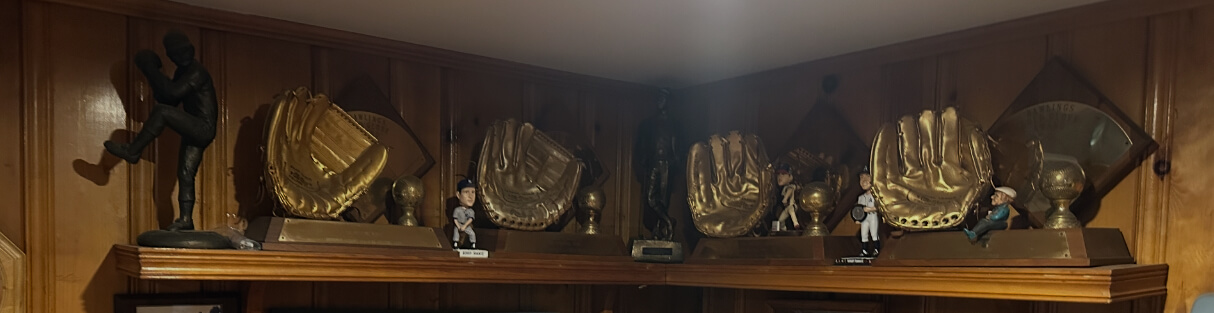 Four of Shantz’s eight Gold Gloves remain on display in his home. (Tyler Kepner/The Athletic)