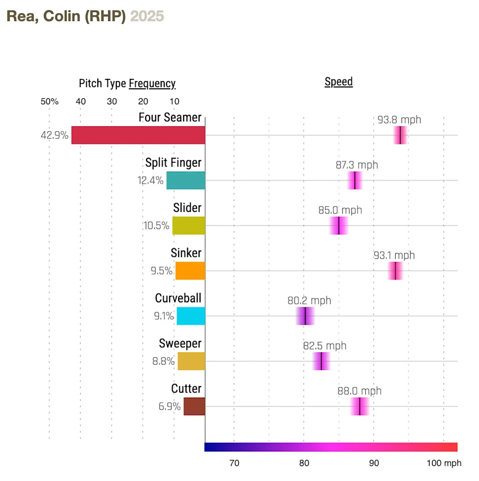 He made his MLB debut July 28 and has made four starts. He has yet to complete six innings in any of them, and in his last two didn’t make it out of the fourth. He’s never faced the Cubs or anyone on their active roster. Per his pitch selection chart below, he throws a lot of offspeed stuff. Let’s hope Cubs hitters clobber that pitch selection — 0ther teams have, as he’s allowed five home runs in 18.1 MLB innings.