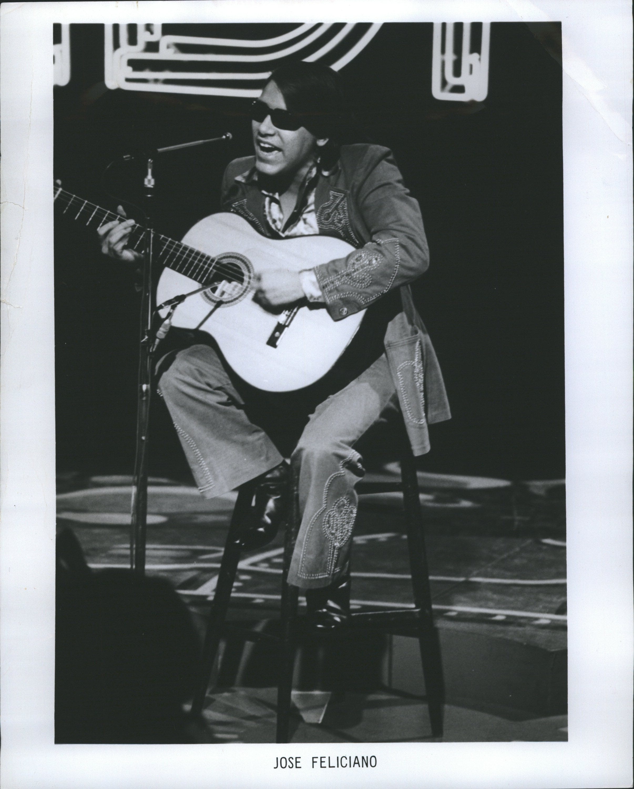 Blind Puerto Rican singer, Jose Feliciano, with his seeing eye dog Trudy, sings the national anthem before the 5th World Series game at Tiger Stadium.