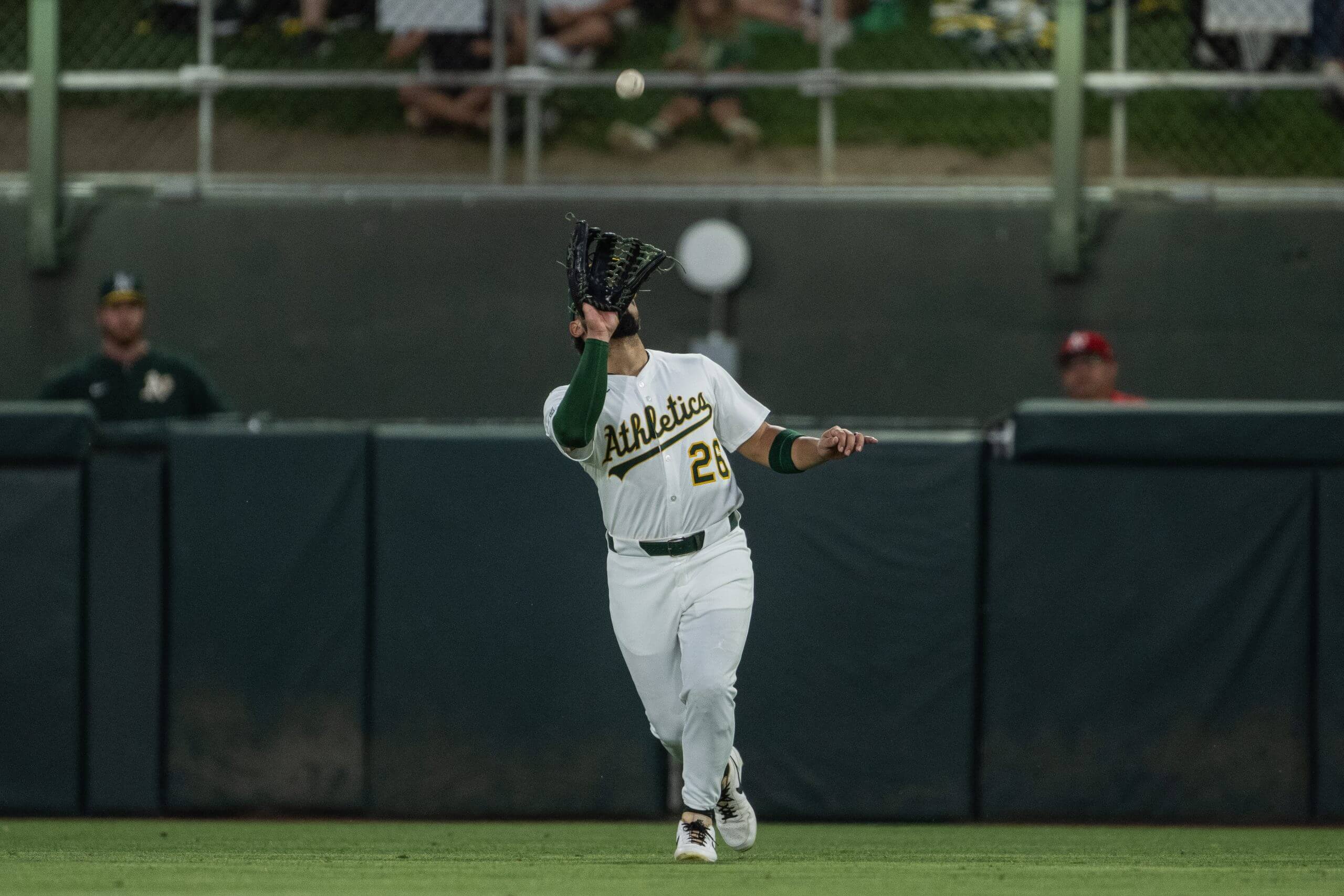 Carlos Cortes makes a catch while playing the outfield left-handed last month. (Justine Willard / Athletics / Getty Images)