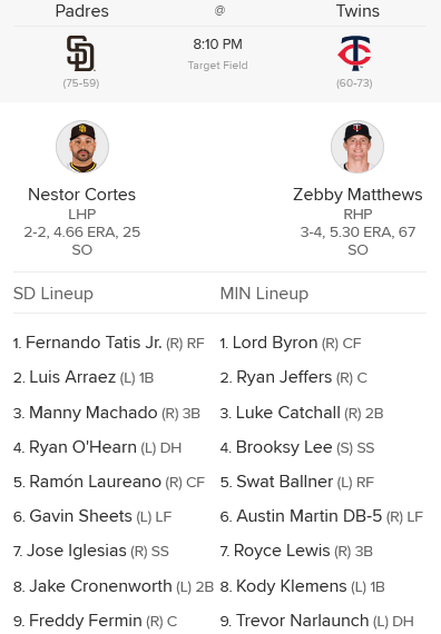 The Padres starter, Nestor Cortes, was traded by the Yanquis to Milwaukee in December, and from Milwaukee to San Diego for some light-hitting OF dude, and Cortes has only pitched in six games all year and Zebby Matthews isn’t very good yet, sooooo…