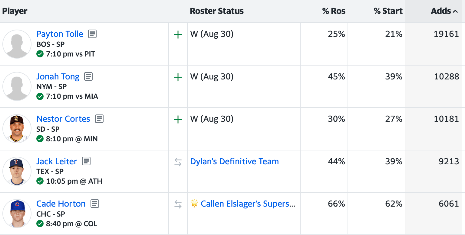 It was an all-streaming pitcher day yesterday, with some of the more common picks on this list as well as two MLB debuts at the top!