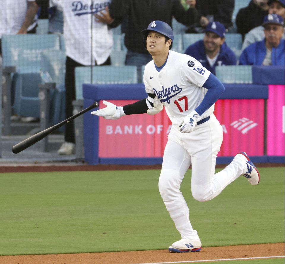 Shohei Ohtani of the Los Angeles Dodgers runs to first base after hitting a leadoff home run against the Athletics at Dodger Stadium in Los Angeles on May 14, 2025. (Kyodo) ==Kyodo