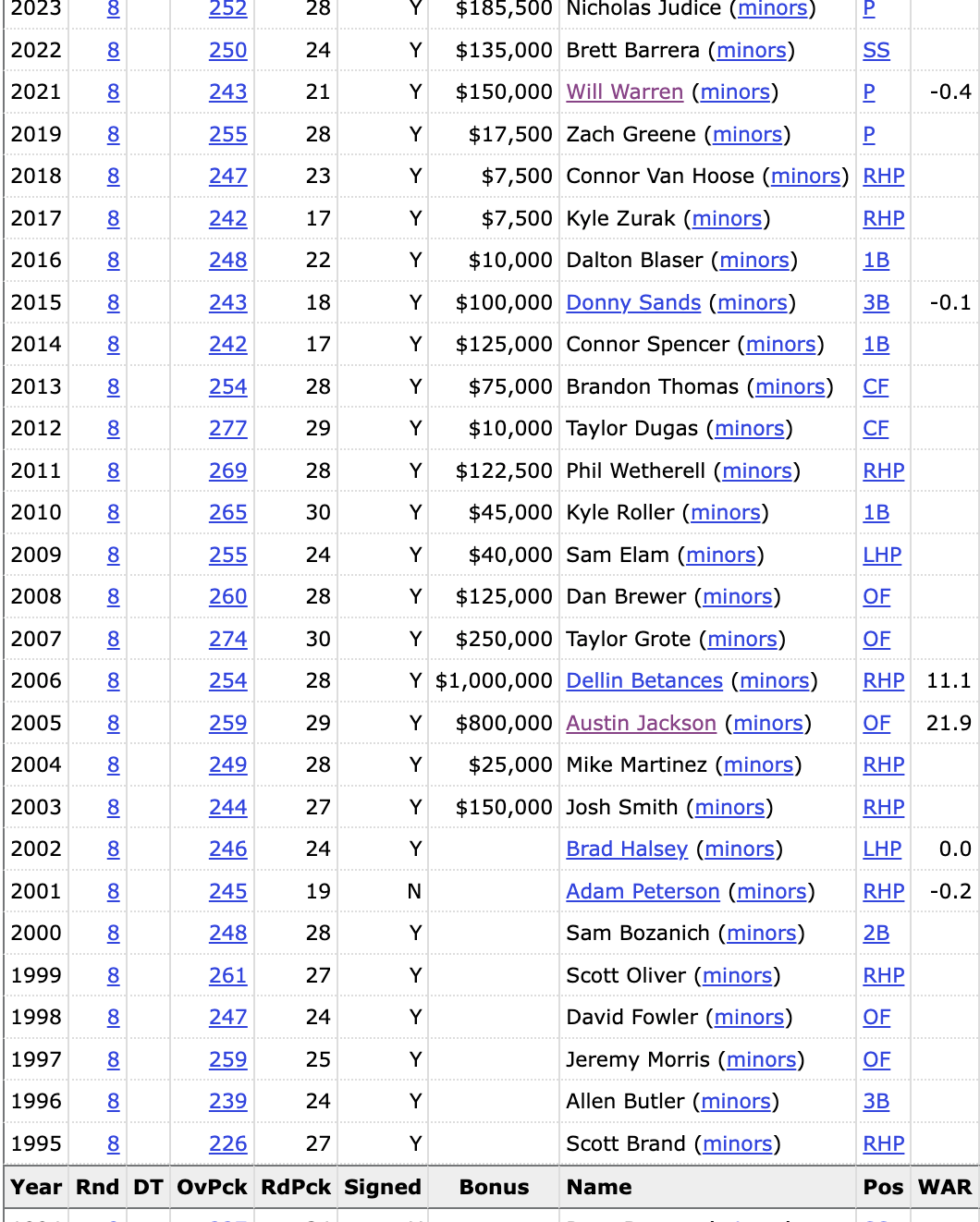 How does Warren stack up to not only recent Yankees’ eighth-rounders, but the ones in his class? rWAR really doesn’t like Warren (mostly due to his disastrous 2024 debut), but he’s been one of the best to come from the eighth round in the 2021 MLB Draft, up there with White Sox reliever Mike Vasil and Red Sox starter Hunter Dobbins. Only six of the 30 picks in this round have even debuted. In recent Yankees’ history? Warren will probably be the best eighth-rounder since Austin Jackson and Dellin Betances were picked in back-to-back years in 2005-06. Since then, only Donny Sands had even cracked the bigs.